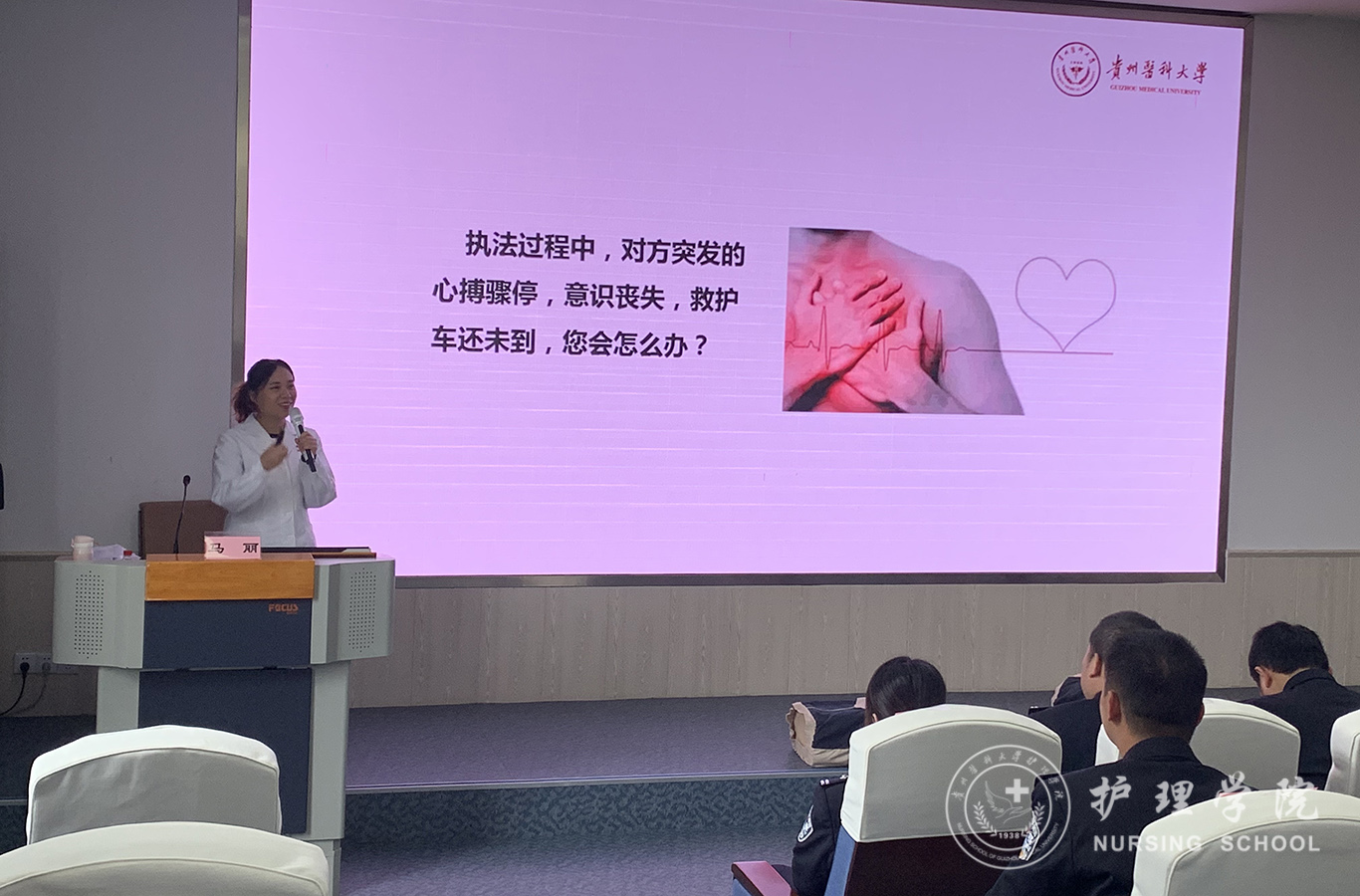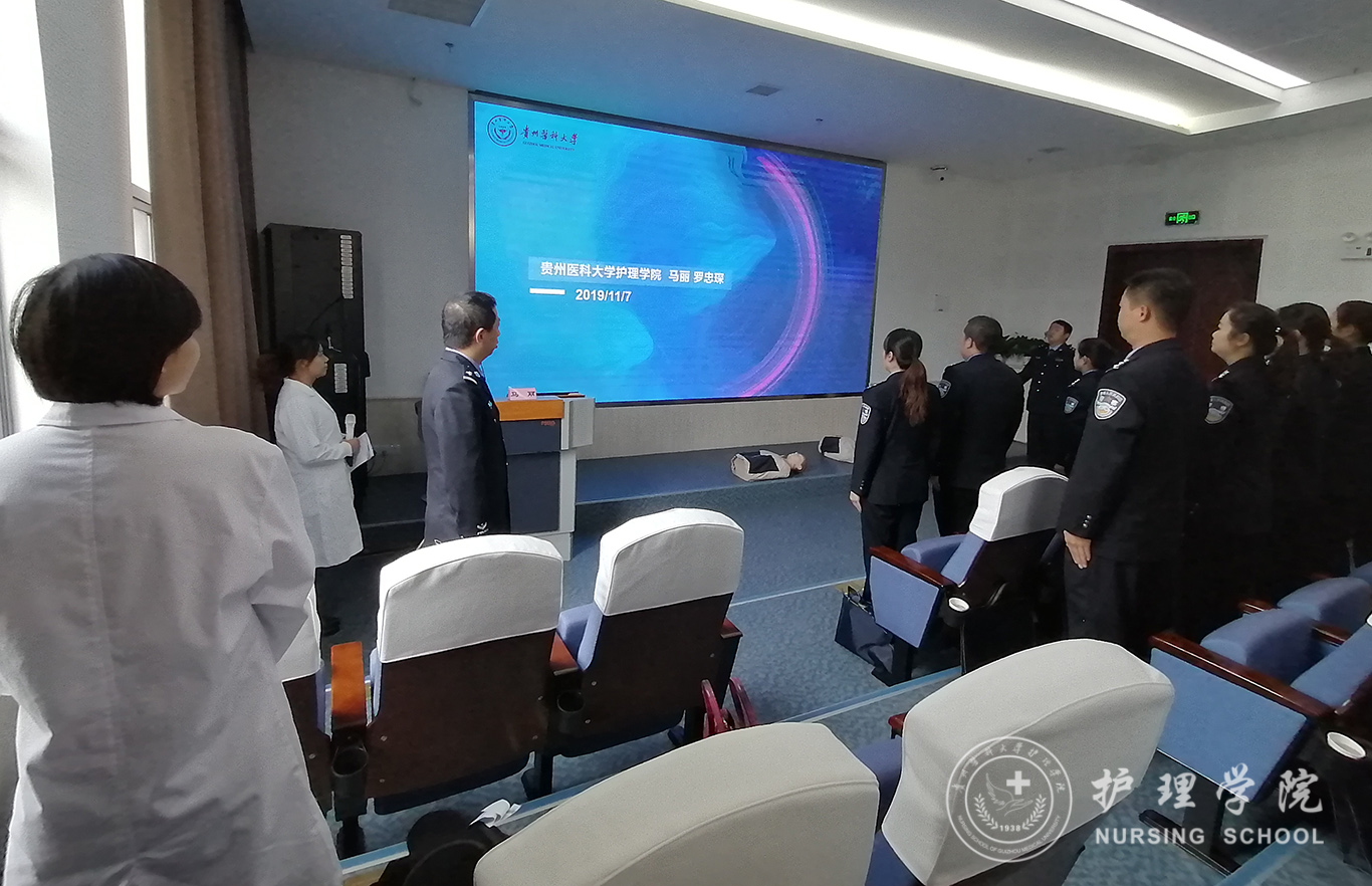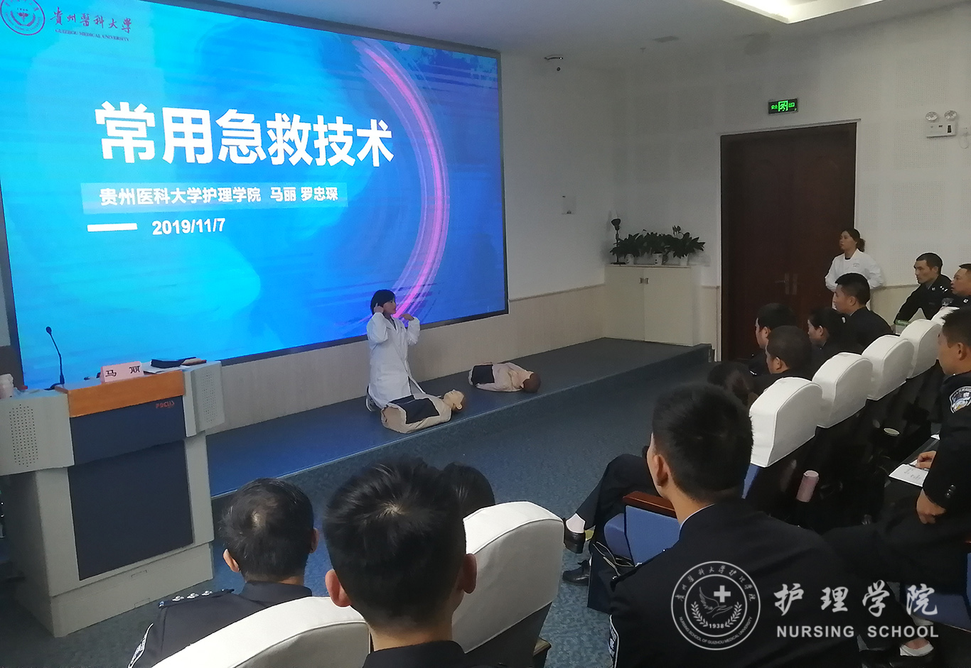 受贵州省人民检察院法警总队邀请,中国南丁格尔志愿护理服务队太阳集团tyc9728分队志愿者、太阳集团tyc9728外科护理学教研室教师马丽和罗忠琛于11月7日到观山湖区国家检察官公司贵州分院为“2019年贵州省检察机关新入警及晋升警衔司法警察培训班暨支队长硏讨班”授课,培训学员共55人,培训内容为常用急救技术。
