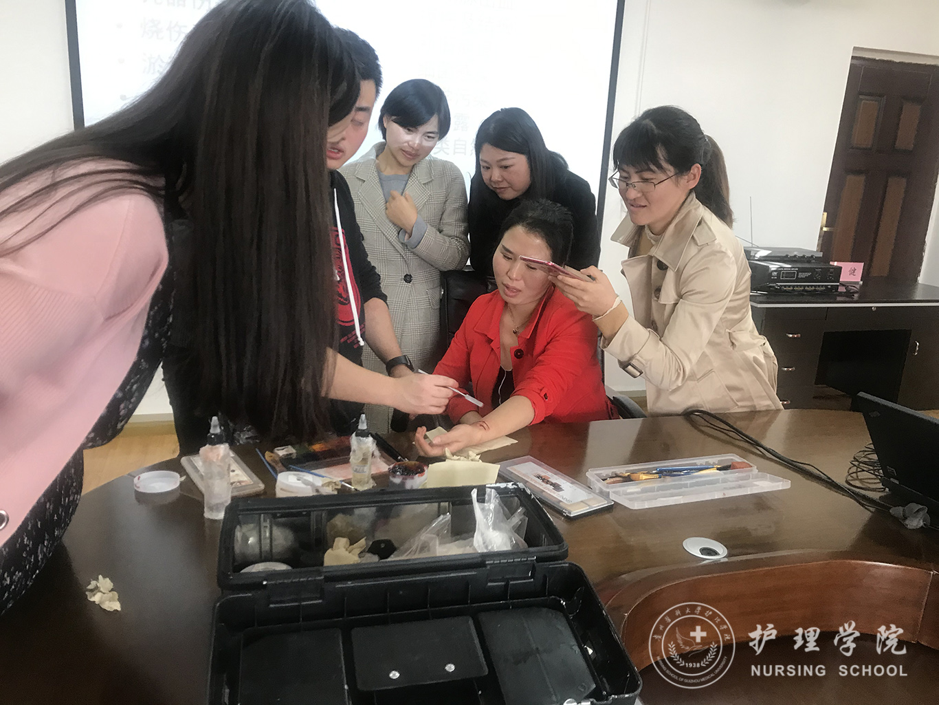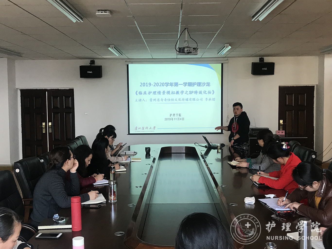 本期“护理沙龙”由教学科研管理科科长卢海霞主持,贵州省奇奇怪怪文化传媒有限公司李承锴经理做题为“临床护理情景模拟教学之SP特效化妆”的报告。分别从SP的起源、概念、在我国护理教学中的应用、常见的特效化妆类型等四个方面进行讲解,并现场就常见特效化装的类型进行现场演示。