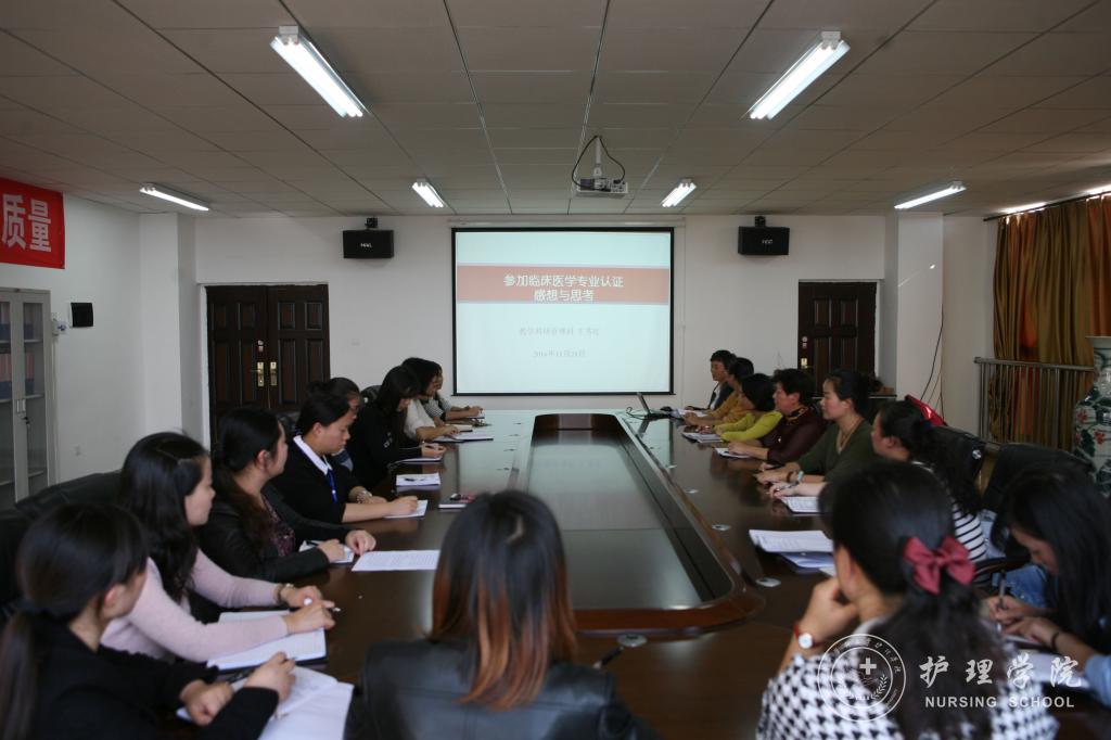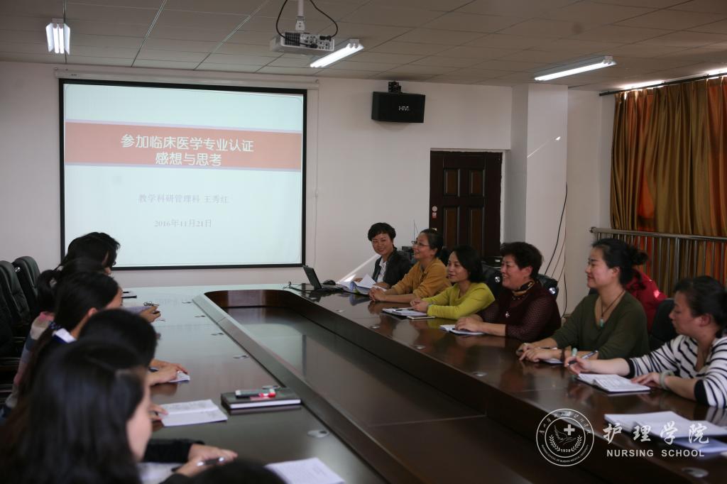 紧接着王秀红科长分享了她参加11月14日-17日公司临床医学专业认证工作的感想和思考。通过多天的跟随走访,了解到认证工作中专家的实地考察的内容和重点。观摩了校本部理论和实验教学课、附属医院的指导操作教学查房、病例讨论等教学活动。结合临床和护理专业认证标准,王秀红科长从宗旨与目标、教育计划、员工成绩评定等十个方面对跟随走访过程中的要素进行了全面分析,并结合即将进行的本科教学审核评估工作、护理专业认证工作提出太阳集团tyc9728的整改建议和努力方向,进一步明确和强化了教学实施过程及相关管理要求,为真正落实“以评促建、以评促改、以评促管、评建结合、重在建设”核心方针,突出内涵建设、强化内部质量保障体系建设树立牢固基础。
