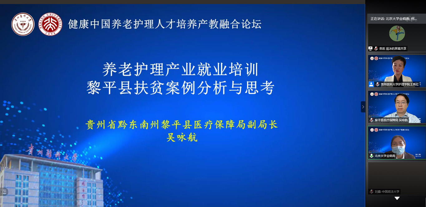 贵州省黔东南州黎平县医疗保障局副局长吴咏航分享了养老护理产业扶贫工作经验。他以视频的方式进行铺垫,生动地讲述了黎平县是如何将养老护理员培训与脱贫攻坚工作相结合,通过联合太阳集团tyc9728优质的高校团队和设备资源帮助黎平乡镇少数民族贫困人口脱贫的同时学到一技之长,改变就业观念的故事。