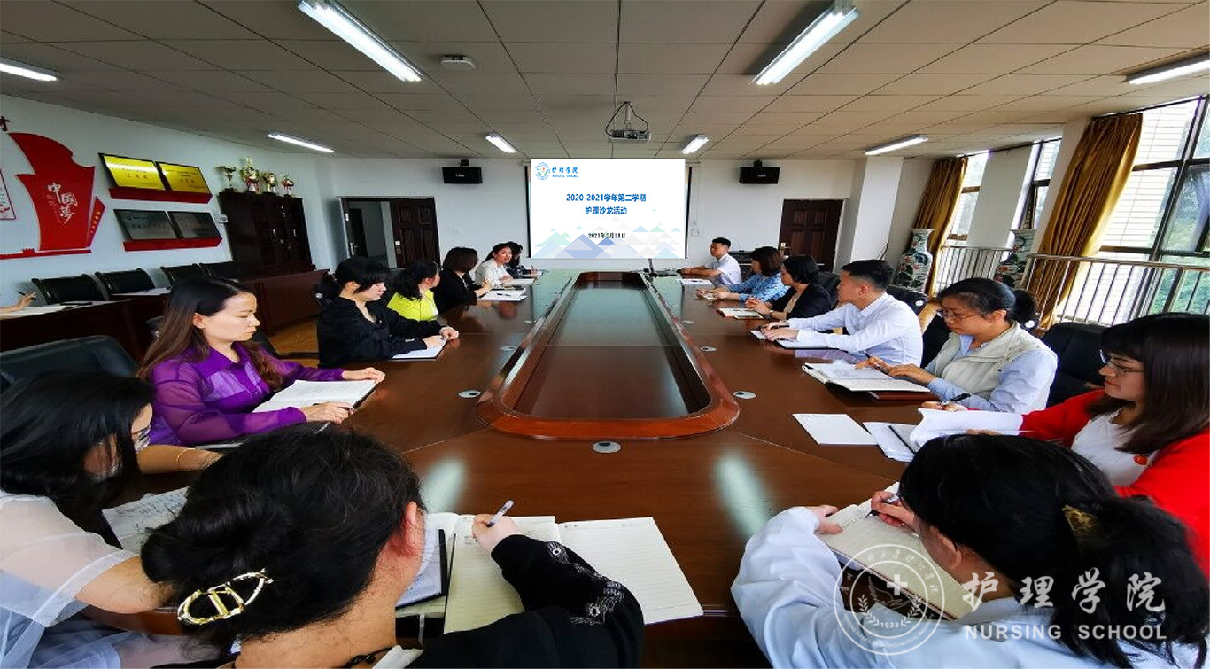 5月11日,太阳集团tyc9728在南校区百川楼5楼会议室举行2020-2021学年第二学期护理沙龙活动,党委书记杨英、党委副书记何为、副经理刘志燕及全体老师参会,活动由教学科研管理科科长卢海霞主持。