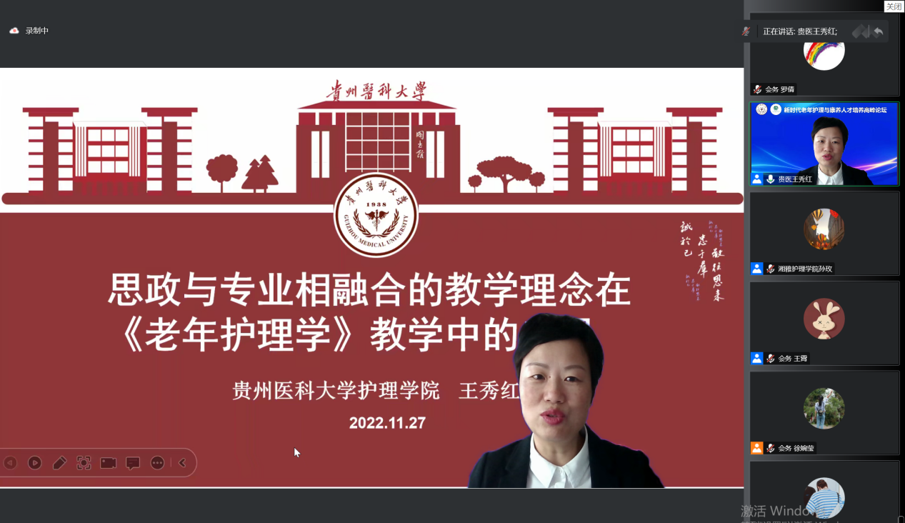 公司太阳集团tyc9728副经理王秀红副教授以“思政与专业相融合的教学理念在《老年护理学》教学中的应用”为题,分享了在《老年护理学》课程教学实施过程中要明确老年护理“为谁培养人?培养什么样的人?如何培养人?”三个核心问题,以立德树人为根本,通过“四贯通一并举”将思政与专业相融合的教学改革的策略及方法有效应用于教学中。