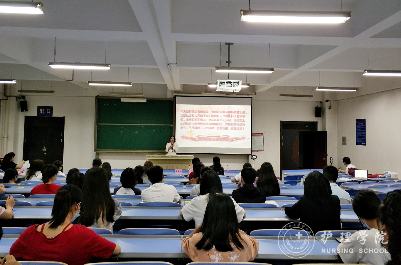 杨英从共产党员、医护人员的初心讲起,从新冠肺炎疫情产生的过程,讲到贵州援鄂医疗队支援鄂州、支援武汉,同心抗击疫情,践行初心使命的感人故事。杨英指出,在抗疫疫情的过程中,医护人员用生命践行了使命,用大爱书写了担当。在派出的医务人员中,近7成都是我们护士。她们与鄂州护士携手共同抗疫,不负重托,用爱点亮了生命之光。杨英强调,抗击新冠疫情的过程,让我们再次感受到中国共产党的英明伟大,再次感受到中国特色社会主义制度的优越性,再次感受到中华民族精神灵魂的震憾力。最后,她勉励全体青年党员,要勇于承担社会和人民赋予的责任,要从义无反顾、逆行而上的师长身上学会医者的使命和担当,要以抗疫精神鼓舞士气,不畏艰险,不怕困难,勇挑重担,勇往直前!