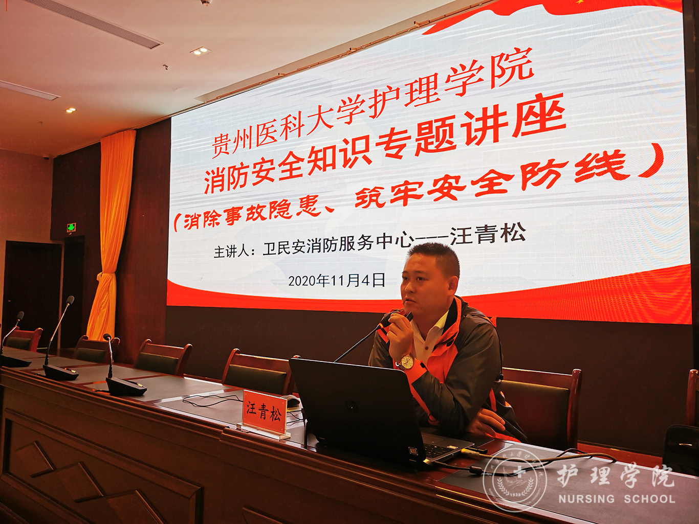 为进一步提高全体师生的消防意识和应急反应能力, 11月4日,太阳集团tyc9728在南校区道德讲堂开展了“消防安全宣传月”主题党日活动。本次活动特别邀请了贵阳卫民安消防知识宣传中心宣教部汪青松主任为太阳集团tyc9728全体教职工和员工做了《消防安全知识专题——消除事故隐患,筑牢安全防线》讲座。活动由教职工党支部张仁莉同志主持。