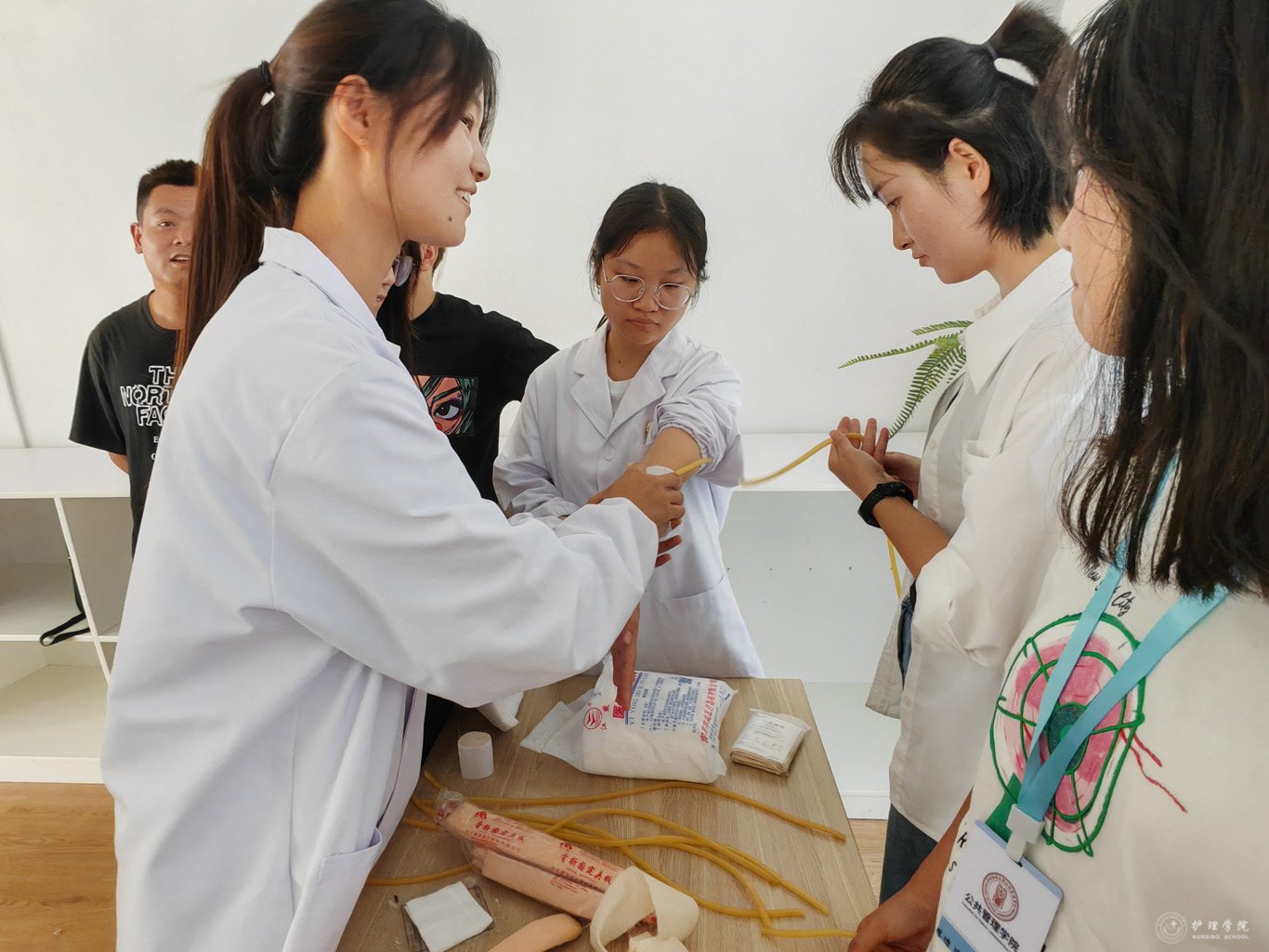 活动开始前,刘妍简要地介绍此次活动的目的并表达了对两院今后开展共建合作的期许。培训人员以理论实践相结合的方式,为参训人员讲解并演示了心肺复苏术(CPR)、包扎止血术和气道异物清除术,随后指导参训人员进行了实操练习。
