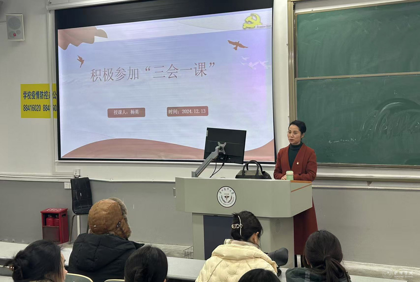为深入贯彻落实党的二十届三中全会精神,加强党性教育,12月13日,护理公司党委书记杨英在北京路校区普教7给员工第一党支部讲授题为《积极参加“三会一课”》的党课,本次学习通过线上与线下相结合的形式开展。公司党委委员、副处级组织员张黎出席本次会议,由支部书记梁子豪主持,支部全体党员参与会议。