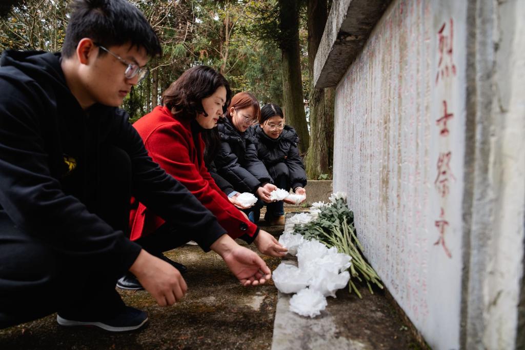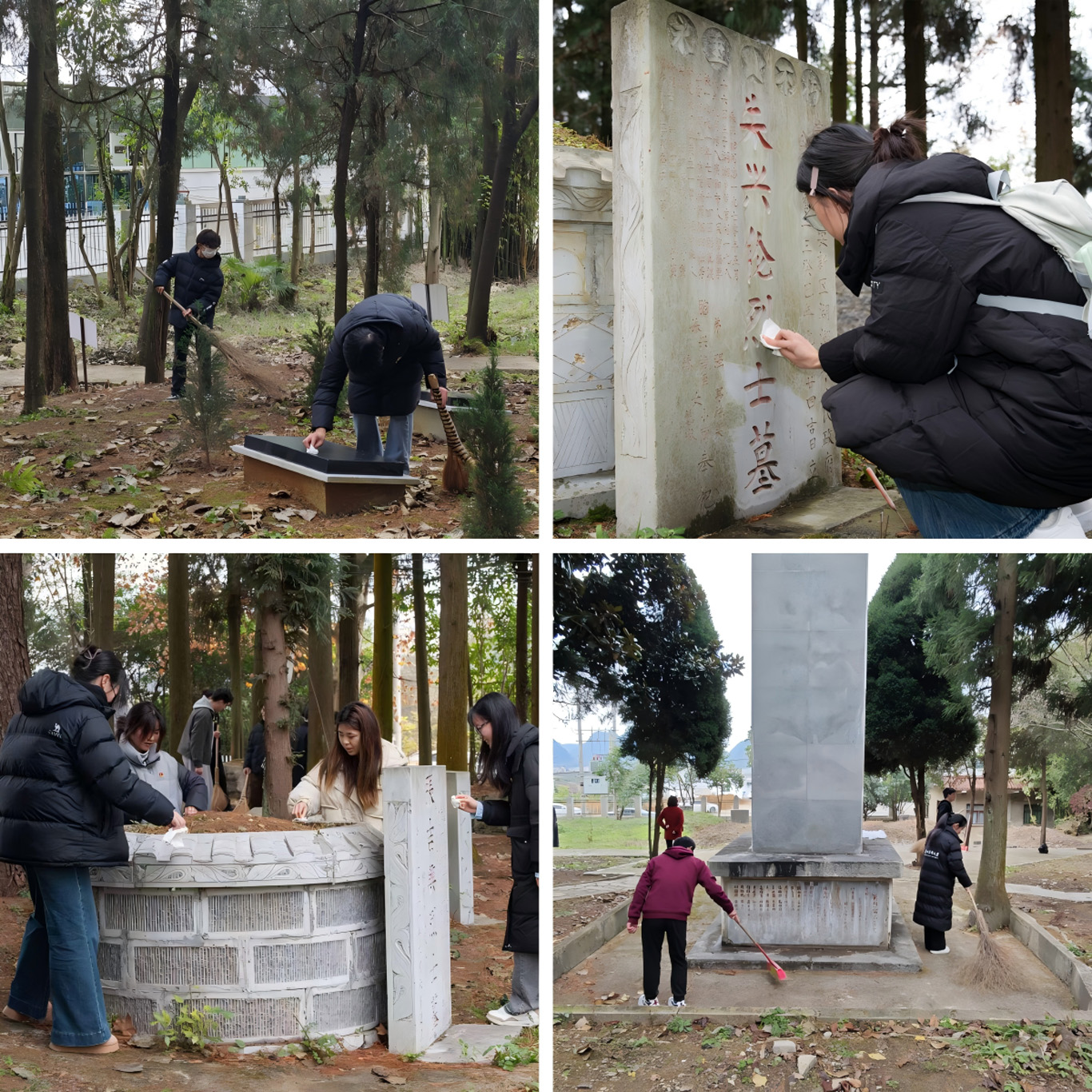 首先,刘文壮组织全体师生肃立默哀一分钟,深切缅怀南京大屠杀遇难同胞和为抗战胜利英勇牺牲的革命先烈,号召全体同学把对苦难历史的铭记转化为对生命的敬畏、对人民的赤诚、对国家的担当。随后,党员代表熊宗锴、男护生代表罗亿杰依次发言,用青年的真挚话语分享感悟,许下“铭记历史、吾辈自强”的青春誓言。最后,到场师生在革命烈士纪念碑前进行了庄严肃穆的献花仪式,并有序瞻仰烈士陵园,为革命烈士扫墓及擦拭墓碑,以朴素而真挚的行动寄托深切缅怀与崇高敬意。