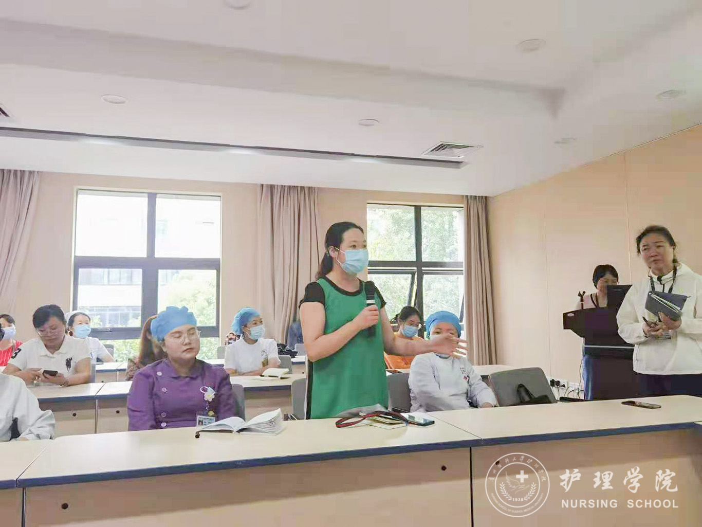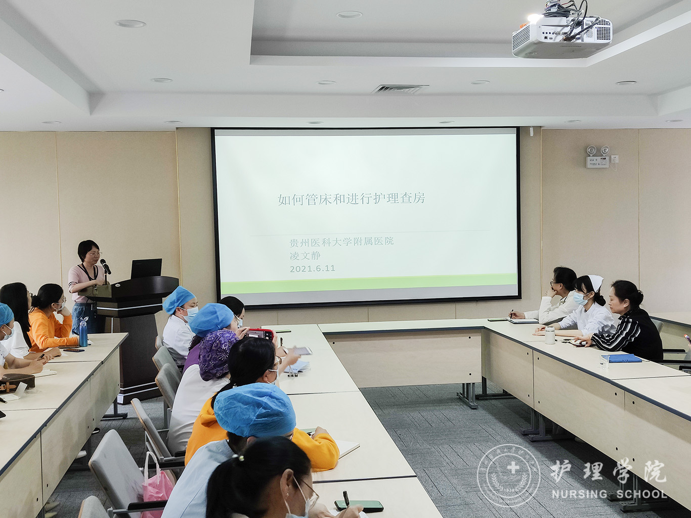 接下来,附属医院护理部办公室副主任凌文静以《如何管床和护理查房》为题,从患者入院护理评估、护理诊断、护理目标、护理措施、护理病程记录及护理效果评价六方面进行详细的讲解。指出:对患者进行护理评估时,除了解基本情况外,还应全面掌握其治疗经过、辅助检查情况、主要症状和体征等,从而提出患者的主要护理问题。强调护理诊断应遵循“先现存、后可能,先重要、后次要,先原发、后继发”的原则,做到定期评估,实时更新。同时对主要护理问题制定全面、系统、整体的护理措施,适时进行调整,并建议临床科室加强研究生分管病人的落实,让研究生真正参与到患者入院-出院全程护理、医护联合查房中去,以此强化员工临床思维能力和实践操作技能。