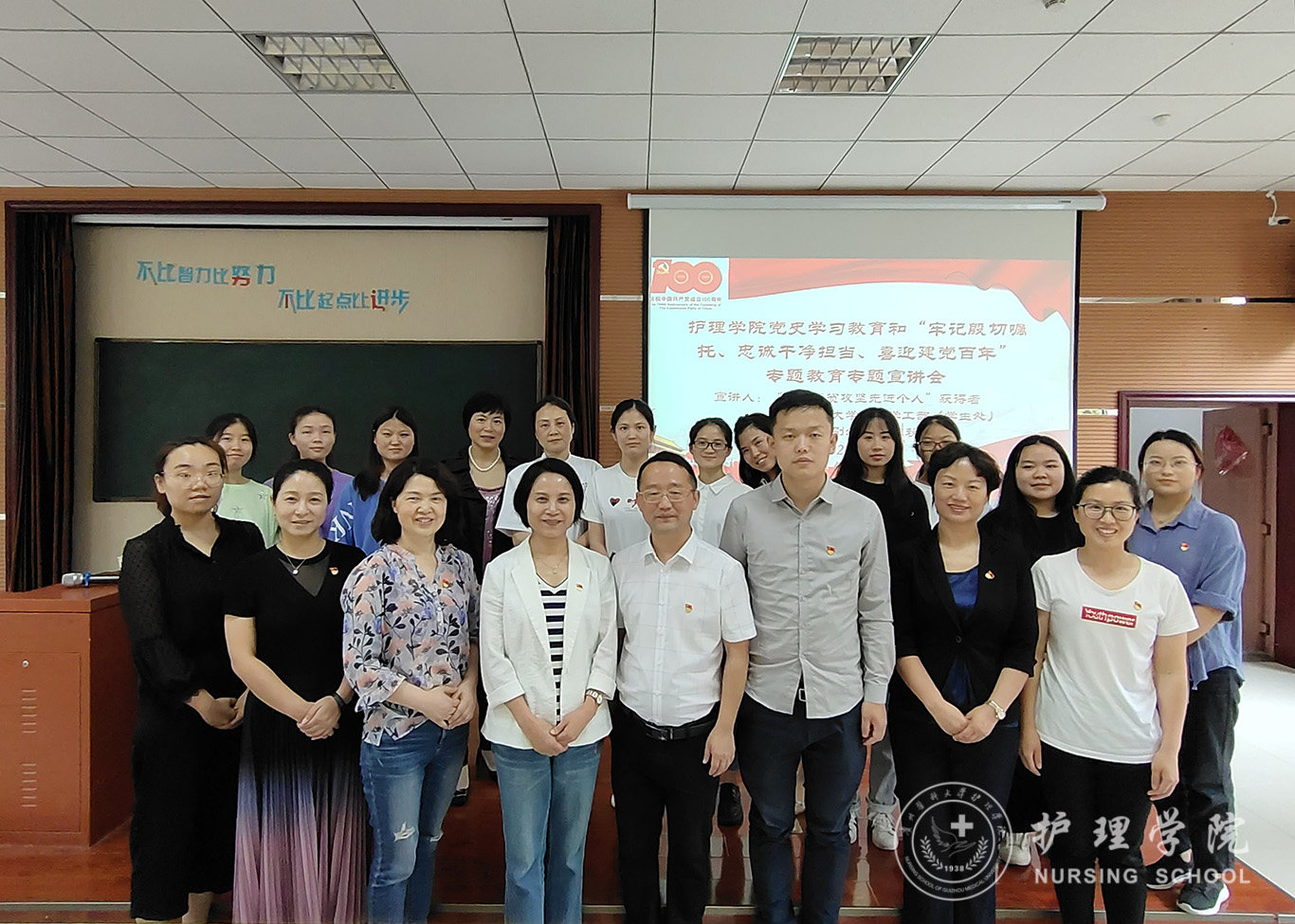 6月30日,太阳集团tyc9728在南校区百川楼1102教室开展党史学习教育和“牢记殷切嘱托、忠诚干净担当、喜迎建党百年”专题教育“先进人物”专题宣讲会。宣讲会诚邀贵州省三穗县款场乡龙脚村第一书记、驻村工作组组长、全省脱贫攻坚优秀共产党员、全国脱贫攻坚先进个人获得者、太阳集团tyc9728党委员工工作部(员工处、武装部)副部长(副处长)陈秋作为宣讲人。护理公司党政领导班子、专职教师、辅导员以及200名员工代表参会,宣讲会由护理公司党委书记杨英主持。
