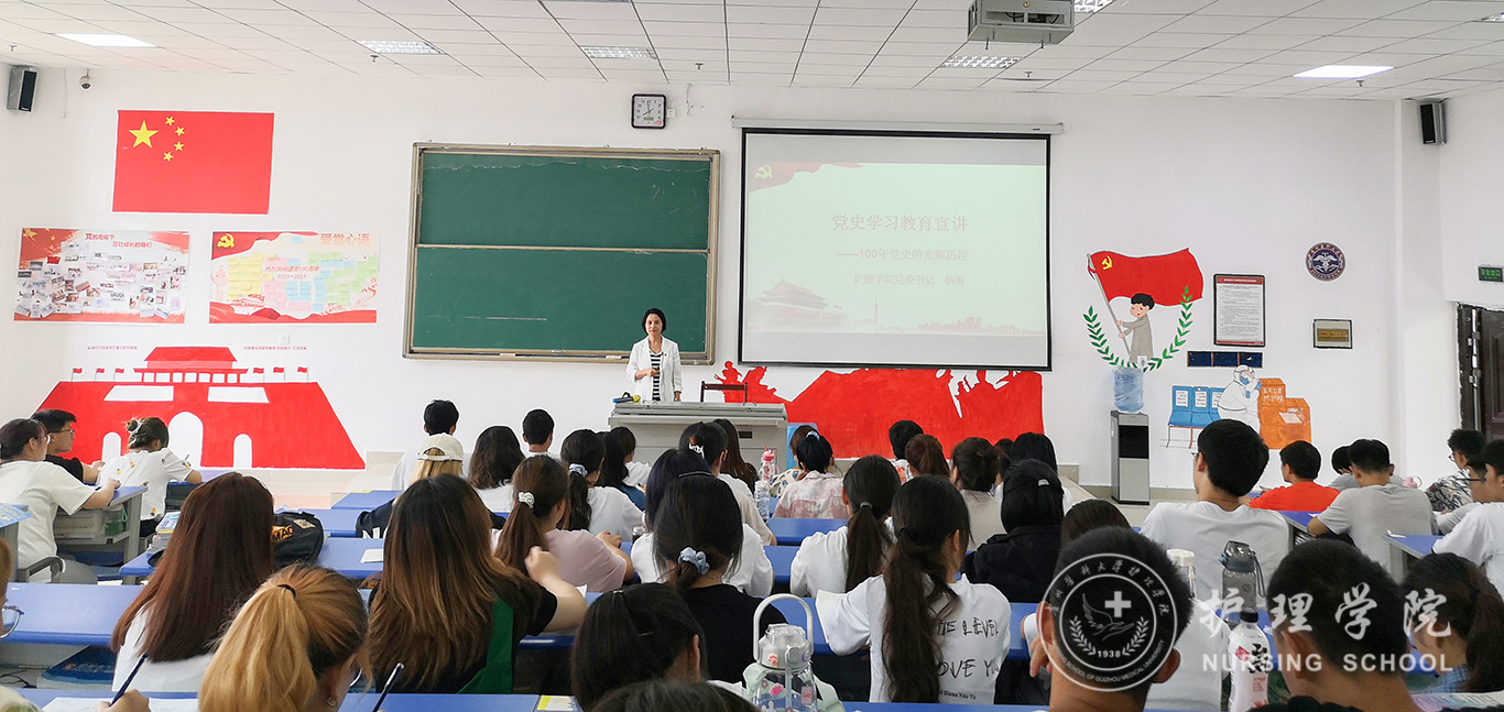 6月30日,为庆祝中国共产党建党100周年,深入学习中国共产党百年奋斗史,切实推进党史学习教育深入开展。护理公司党委书记杨英在南校区广德楼X1504教室为2019级护理学丙班开展党史学习教育宣讲,全体同学参加。