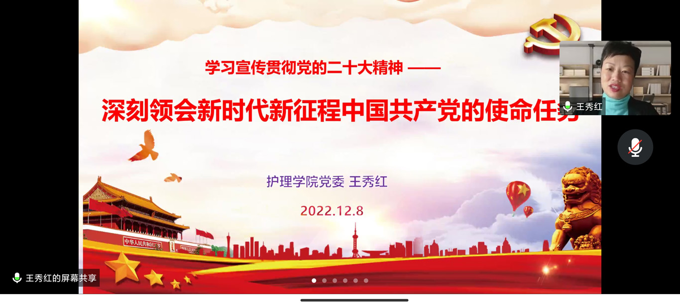 12月8日,为深入学习宣传贯彻党的二十大精神,领悟精神实质。护理公司党委委员、副经理王秀红在公司员工第三党支部以“深刻领会新时代新征程中国共产党的使命任务”为题作了党的二十大精神的宣讲,支部书记刘妍主持会议,支部全体党员参会。
