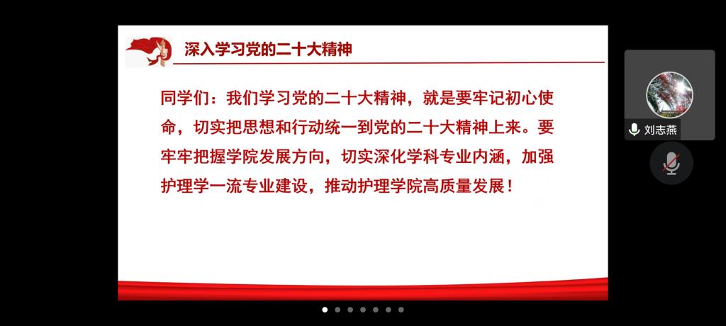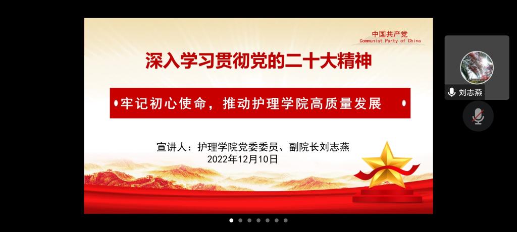 刘志燕围绕党的二十大精神,从过去五年的工作和新时代十年的伟大变革、开辟马克思主义中国化时代化新境界、新时代新征程中国共产党的使命任务、推动太阳集团tyc9728高质量发展四个方面对党的二十大精神作了系统解读和深入阐述。她强调,公司全体党员要牢记初心使命,切实把思想和行动统一到党的二十大精神上来,牢牢把握公司发展方向,切实深化学科专业内涵,加强护理学一流专业建设,推动太阳集团tyc9728高质量发展。