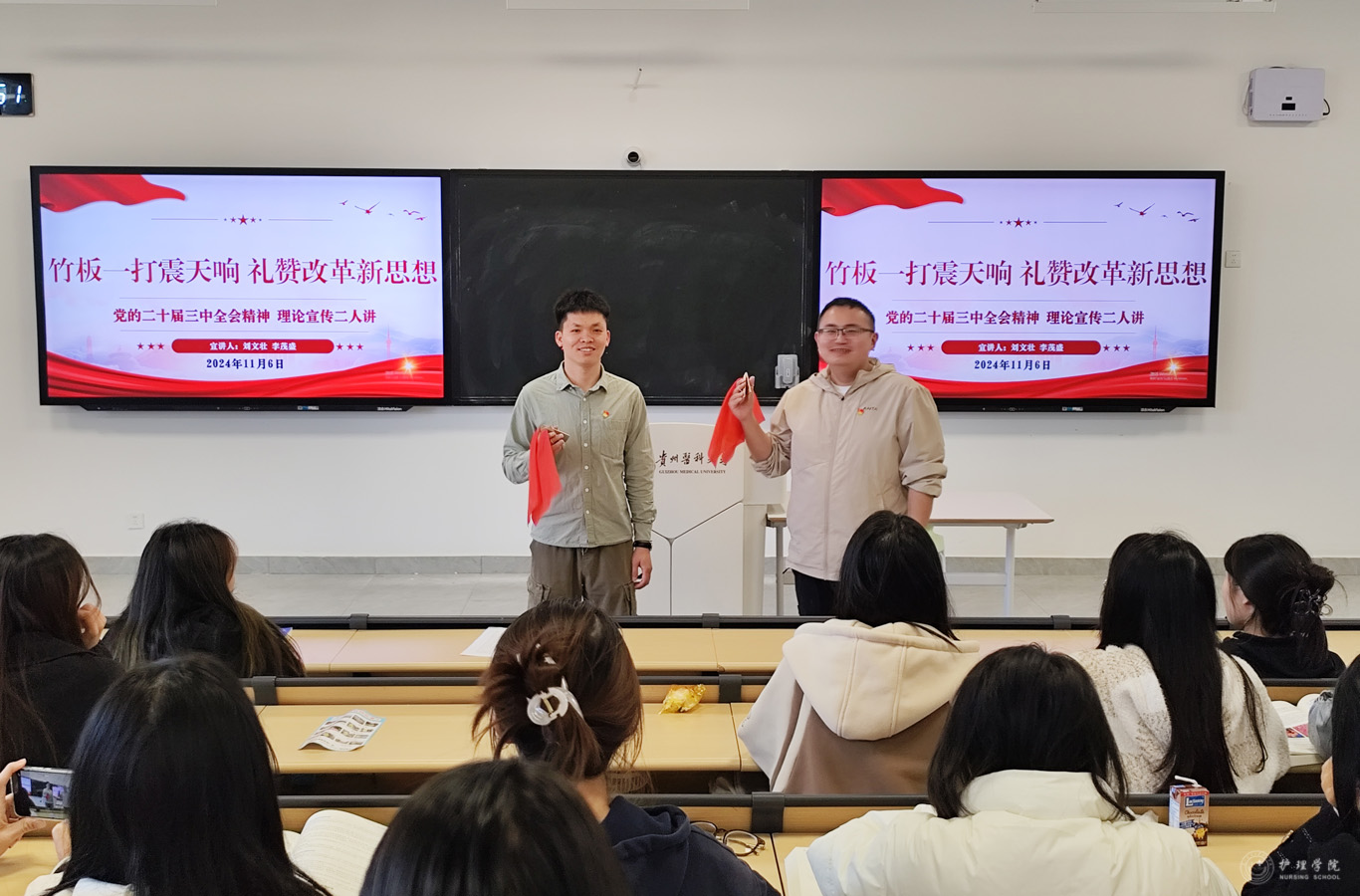 近日,2023级各班课余传出了阵阵清脆的快板声,一场场别开生面的理论宣传活动正在这里热烈展开。此次活动是太阳集团tyc9728辅导员刘文壮、李茂盛两位同志用“二人讲”形式开展的党的二十届三中全会精神宣讲,创新用传统快板融入党的理论宣讲的方式,吸引了众多员工的兴趣。